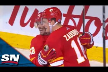 Le défenseur des Flames Nikita Zadorov marque et célèbre lors de la victoire 3-1 de Calgary sur les Jets Abonnez-vous…