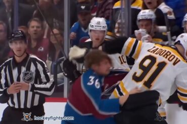 Nikita Zadorov contre Matthew Stienburg des Bruins de Boston lors du match de l’Avalanche du Colorado le 16 octobre 2024.…