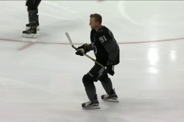 L’attaquant des Penguins de Pittsburgh Evgeni Malkin met la main à la pâte lors de la mise en jeu, se…
