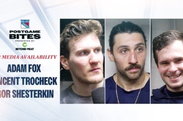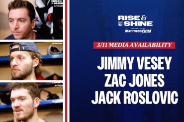 L’attaquant des Rangers de New York Jimmy Vesey discute du calendrier à venir, le défenseur Zac Jones discute du match…