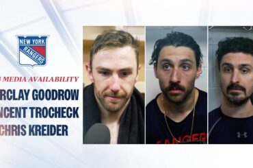 Les attaquants des Rangers de New York Barclay Goodrow, Vincent Trocheck et Chris Kreider parlent avec les médias après la…