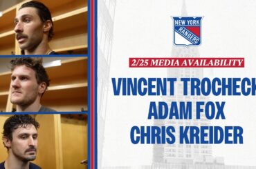L’attaquant des Rangers de New York Vincent Trocheck, le défenseur Adam Fox et l’attaquant Chris Kreider parlent avec les médias…