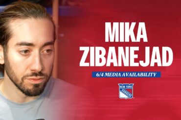 L’attaquant des Rangers de New York Mika Zibanejad s’adresse aux médias lors de la journée de sortie de l’équipe 2024,…