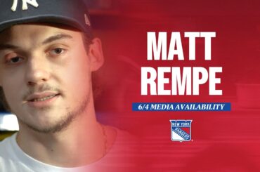 L’attaquant des Rangers de New York Matt Rempe s’adresse aux médias lors de la journée de sortie de l’équipe 2024,…