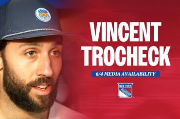 L’attaquant des Rangers de New York Vincent Trocheck s’adresse aux médias lors de la journée de sortie de l’équipe 2024,…