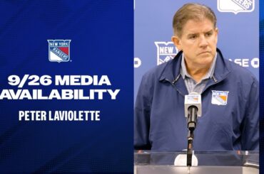 L’entraîneur-chef des Rangers de New York, Peter Laviolette, discute du jeu de Victor Mancini et du match préparatoire de ce…