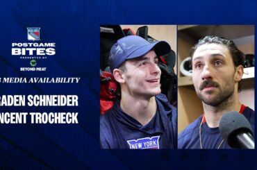 Le défenseur des Rangers de New York Braden Schneider discute de son but en deuxième période et l’attaquant Vincent Trocheck…