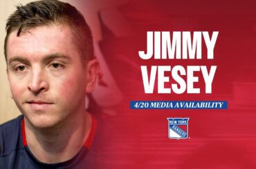 L’attaquant des Rangers de New York Jimmy Vesey discute du prochain match éliminatoire avec les Capitals de Washington après l’entraînement…