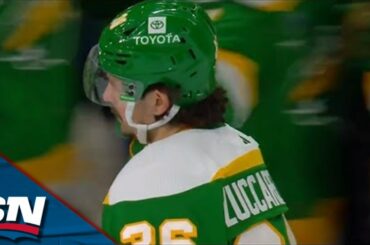 Regardez l’attaquant du Wild du Minnesota Mats Zuccarello tomber sur la glace avant de tirer la rondelle de ses genoux…