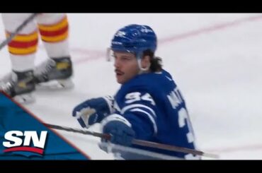 Regardez l’attaquant des Maple Leafs de Toronto Auston Matthews tirer la rondelle devant le gardien des Flames de Calgary Daniel…