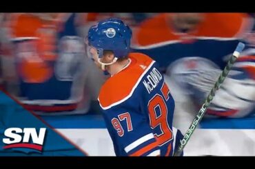 Regardez l’attaquant des Oilers d’Edmonton Connor McDavid recevoir une passe de Ryan Nugent-Hopkins et marquer en avantage numérique pour prolonger…