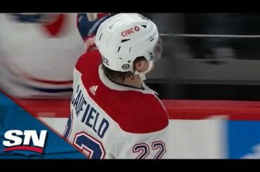 Regardez l’attaquant des Canadiens de Montréal Cole Caufield marquer une fois son 20e but de la saison sur une passe…