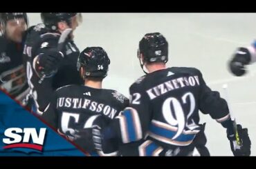 Regardez le défenseur des Capitals de Washington Erik Gustafsson marquer sur un va-et-vient avec Evgeny Kuznetsov pour ouvrir le pointage…