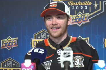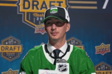 Le défenseur des Flint Firebirds Tristan Bertucci rencontre les médias à Nashville après avoir été sélectionné 61e au total par…
