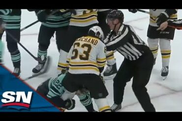 Regardez alors que l’attaquant des Bruins de Boston, Brad Marchand, semble battre du pied Oliver Bjorkstrand du Seattle Kraken, alors…