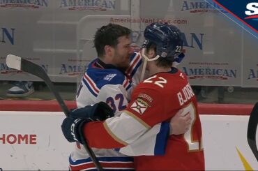 Mackie Samoskevich des Panthers décoche un tir devant Jonathan Quick des Rangers, mais cela arrive si vite qu’il entre et…