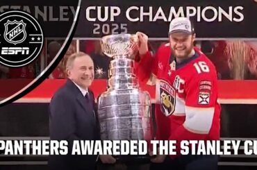 Regardez le commissaire de la LNH, Gary Bettman, présente la Coupe Lord Stanley à la Florida Panthers, le capitaine Aleksander…