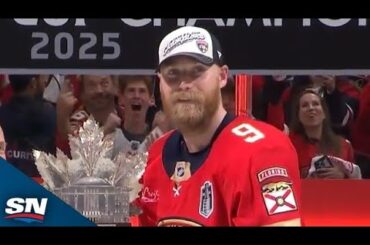 Regardez l’attaquant des Panthers de la Floride, Sam Bennett, reçoit le trophée Conn Smythe 2025 comme le joueur le plus…