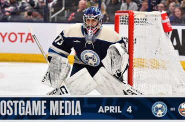 Zach Werenski, James Malatesta, Johnny Gaudreau et l’entraîneur-chef Pascal Vincent parlent aux médias après le match de ce soir en…