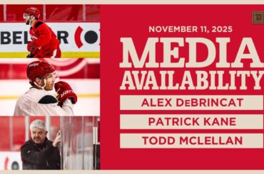 Alex DeBrincat, Patrick Kane et Todd McLellan parlent avec les médias après l’entraînement de Détroit le mardi 11 janvier 2025.