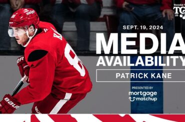 Patrick Kane s’adresse aux médias le premier jour du camp d’entraînement au Centre Ice Arena de Traverse City, dans le…