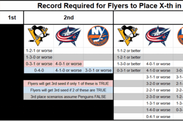 Tableau approximatif que j’ai dressé décrivant les résultats possibles des 5 derniers matchs des Flyers, puis les records que les…