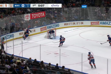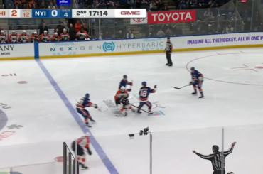 L’attaquant des Flyers Matvei Michkov encaisse un Ilya Soroking sans méfiance, prolongeant l’avance de Philadelphie sur les Islanders à 3-0…