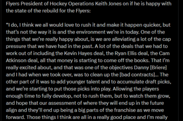 [97.5 The Fanatic] Le président des opérations hockey des Flyers, Keith Jones, explique s’il est satisfait de l’état de la…