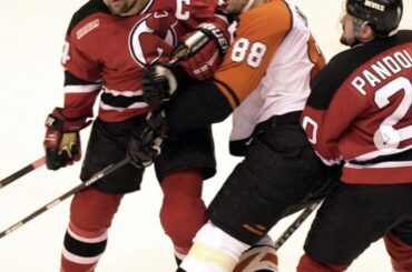 Scott Stevens fait la poupée de chiffon Eric Lindros dans un match Devils-Flyers. Rivalité de la fin des années 90…
