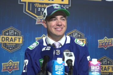 Le défenseur des Flint Firebirds Tristan Bertucci rencontre les médias à Nashville après avoir été sélectionné 61e au total par…