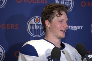Leon parle avec les médias alors qu’il rejoint les Oilers à son retour des Jeux olympiques d’hiver mardi.