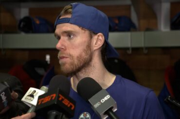 Connor discute avec les médias après avoir récolté cinq passes décisives lors de la victoire 5-1 des Oilers contre les…