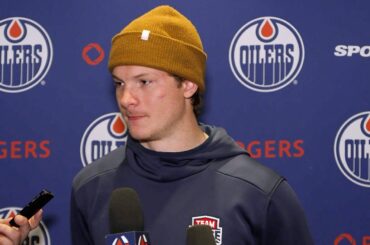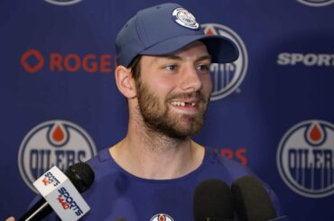 Kasperi discute avec les médias après l’entraînement des Oilers à Rogers Place vendredi.