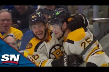 David Pastrnak vole la rondelle et est refusé lors d’une échappée, mais s’y tient et trouve un Brad Marchand grand…