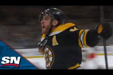Regardez l’attaquant des Bruins de Boston David Pastrnak tirer parti d’une rondelle lâche, tirant à la maison un rebond sur…