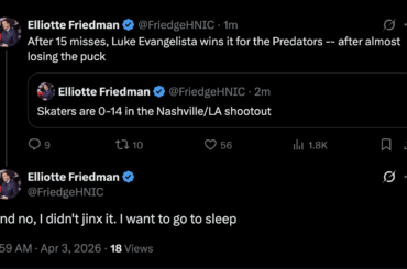 [Friedman] Après 15 ratés, Luke Evangelista remporte la victoire pour les Predators – après avoir presque perdu la rondelle. Et…