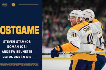 Steven Stamkos, le capitaine Roman Josi et l’entraîneur-chef Andrew Brunette parlent aux médias après la victoire 3-2 en prolongation de…