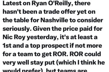 [LeBrun] Dernièrement concernant Ryan O’Reilly, il n’y a pas encore eu d’offre commerciale sur la table que Nashville puisse considérer…