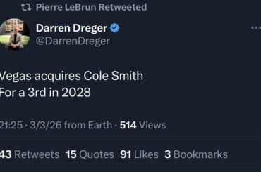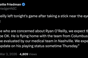 [Friedman] Ryan O’Reilly a quitté le match de ce soir après s’être cogné un bâton près de l’œil. De l’équipe…
