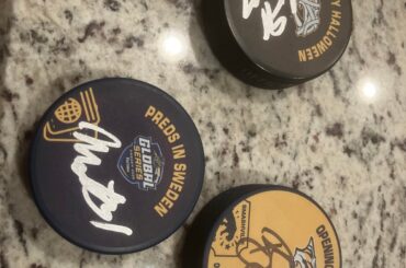 J’ai fini par lui donner : un chapeau signé par l’équipe, un drapeau signé Marchessault, un vinyle signé par Hinostroza, une…