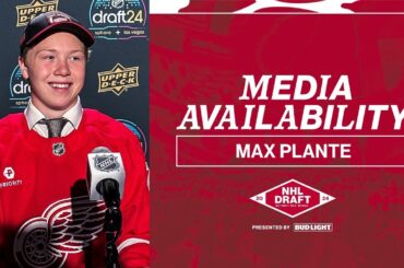 Max Plante, choix de deuxième ronde (47e au total) des Red Wings, s’adresse aux médias lors du deuxième jour du…