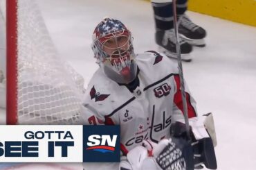 Regardez le gardien des Capitals Charlie Lindgren tenter de dégager la rondelle, mais la tire maladroitement dans son propre filet…