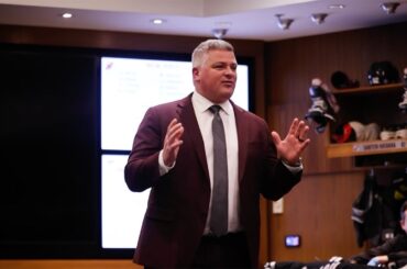 L’entraîneur-chef des Devils du New Jersey, Sheldon Keefe, s’adresse à l’équipe après une grande victoire 4-2 à domicile contre la…