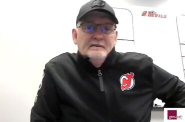 L’entraîneur-chef des Devils Lindy Ruff s’entretient avec les médias après la victoire de l’équipe dans le match 4 au Madison…