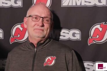 L’entraîneur-chef des Devils, Lindy Ruff, s’adresse aux médias avant leur match contre les Sabres de Buffalo.