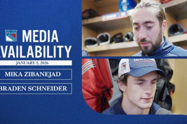 L’attaquant des Rangers de New York Mika Zibanejads et le défenseur Braden Schneider parlent avec les médias après la défaite…