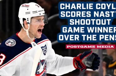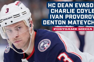 L’entraîneur-chef Dean Evason, Charlie Coyle, Ivan Provorov et Denton Mateychuk s’adressent aux médias après le match. Suivez le #CBJ sur…
