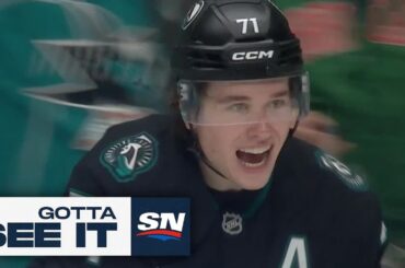 Regardez la star des Sharks de San Jose, Macklin Celebrini, marquer un but pour le moment fort, recevant la rondelle…