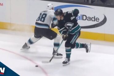 Regardez l’attaquant des Sharks de San Jose Will Smith capter une passe de Macklin Celebrini et danser devant le défenseur…