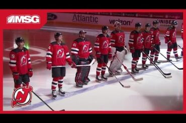 Les joueurs et entraîneurs des Devils du New Jersey sont présentés lors d’une soirée d’ouverture unique de la saison 2021…